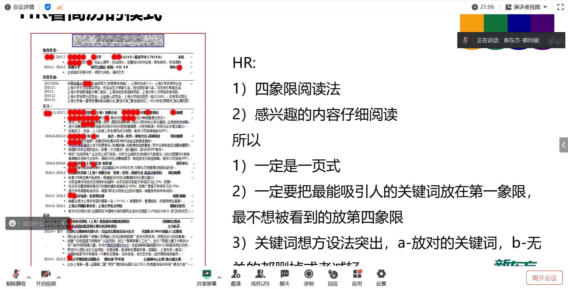 为进一步提高毕业生的就业竞争力,为学生们求职打好坚实基础,319日下午1500,我院邀请新东方郭玲丽老师举办了线上求职简历指导讲座,本次讲座由辅导员王锦老师主持,202020余名同学参加。